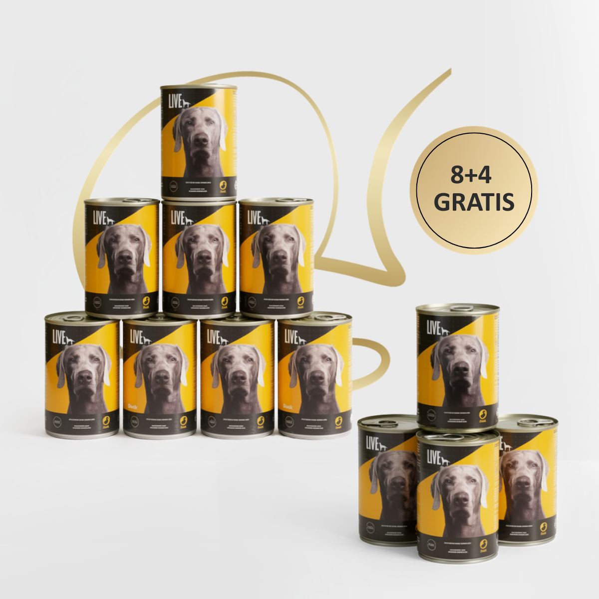 + 50% FREE – zestaw 12 puszek karmy mokrej LIVE dla psa w każdym wieku. Wszystkie rasy – kaczka 395g