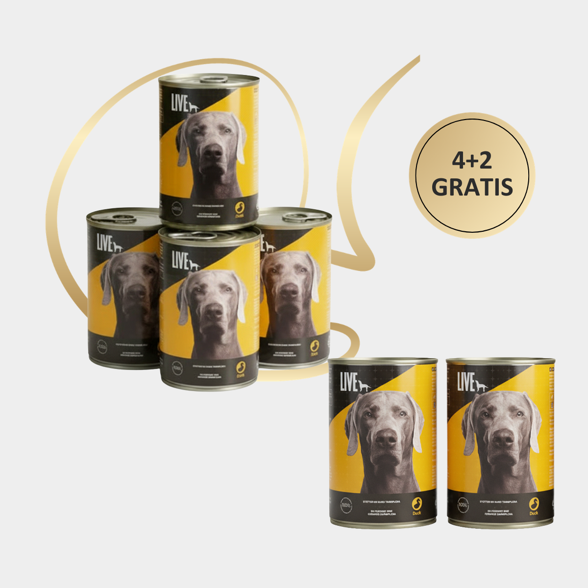 + 50% FREE – zestaw 6 puszek karmy mokrej LIVE dla psa w każdym wieku. Wszystkie rasy – kaczka 395g