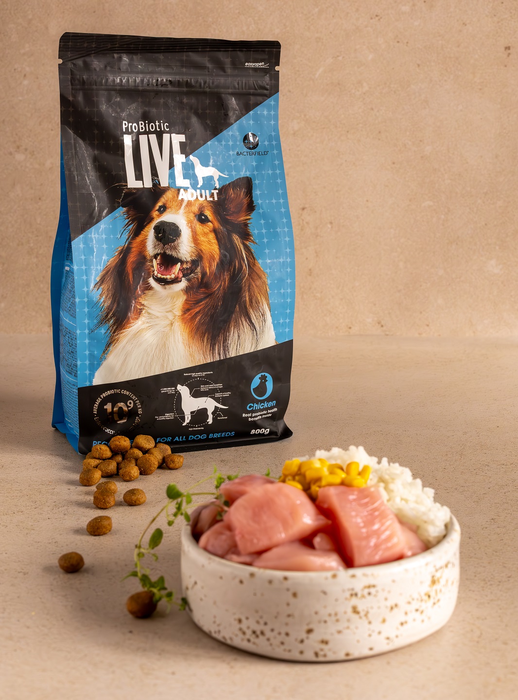 Linia ProBiotic LIVE to karma stworzona z mięsa mięśniowego najwyższej jakości, poddanego procesowi powolnego suszenia (dehydratyzacji). Mięso wykorzystywane w procesie produkcji pochodzi wyłącznie od certyfikowanych dostawców z Unii Europejskiej. ProBiotic LIVE zawiera białko, które dzięki hydrolizie (proces rozbicia na mniejsze cząsteczki), jest łatwiej przyswajalne i mniej alergizujące dla psa.
