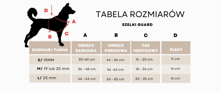 Standardowe rozmiary szelek Guard to: S, M, L. Dzięki temu, że szelki posiadają aż 4 miejsca regulacji możecie dostosować je do wymiarów swojego psiaka, a jeśli macie szczeniaka lub młodego psa – szelki będą rosły razem z nim!